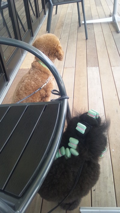 これからの季節はちょっとキツイですけど~。ご飯を買いに行ったダーちゃんを待つ忠犬たち。