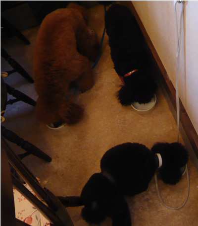 人間ご飯のときは、山羊ミルクを飲むわんこたち。