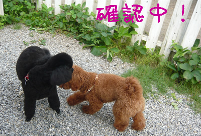シャイなモモ姫、腰がひけてますが、お友達と匂いをかぎあって確認中。