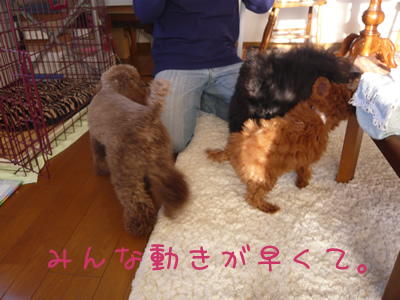 5ヶ月のベビー+7ヶ月のトイプードル(ライム/ブラック)+1才のトイプードル(マーク/カフェオレ)という大所帯で☆