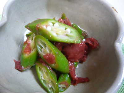 これまた最近毎週大量に届くオクラを軽く茹でて、梅干しとあえてみた。